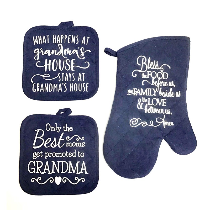 3 - Piece Grandma Gift Set - 2 - Pot Holders - 1 - Oven Mitt - Hot Pads Kitchen Decor - Grandmother - Baking Navy Blue