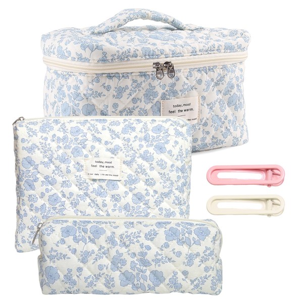 - Quilted design cosmetic bag set: the toiletry bag for women has an elegant blue flower pattern and quilted design and offers a beautiful, fashionable and unique look. The small cosmetic bag uses cotton for shaping and is reinforced with delicate seams, it gives your everyday look a touch of elegance and is therefore an eye-catching accessory for any occasion.