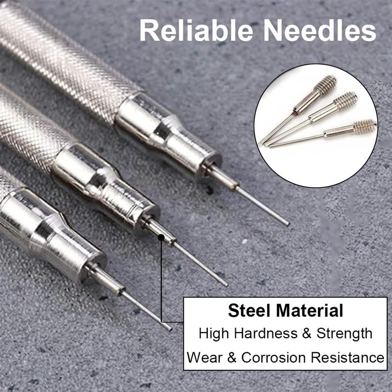 【Precise Fit】Equipped with three needle sizes: 0.7 mm, 0.8 mm, 0.9 mm, as well as three replacement needles, it makes the repair work more flexible and versatile. Whether it is the fine tuning of tiny parts of the watch or responds to different maintenance needs, watch repair tool with 3 alternative needles can be easily treated, which not only improves work efficiency, but also highlights the wide applicability and practicality of the tool.