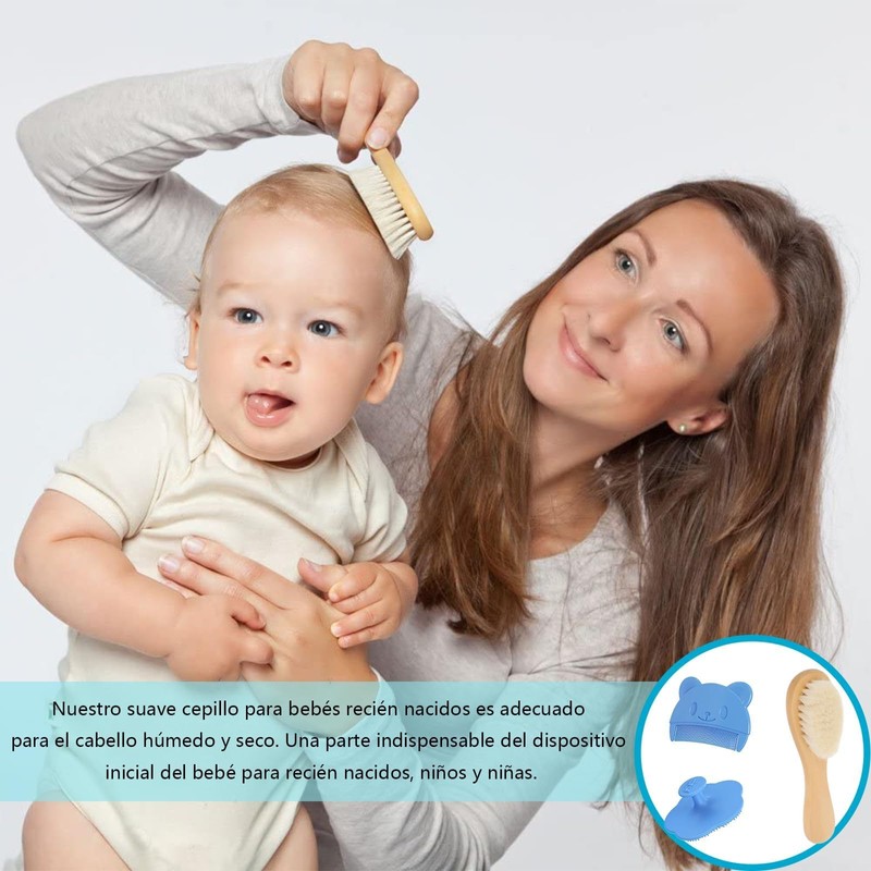 3 Piezas De Cepillo Para Bebé, Peine Para Bebe,Cepillo Bebe, Cepillo De BañO Para BebéS, Suave Ayuda A Masajear Suavemente El Cuero Cabelludo Para ReciéN Nacidos Y BebéS【contenido del producto】 : obtendrá 3 piezas de Cepillo Para bebé, que contiene un peine de oso azul, un Cepillo de oso Para lavar el cabello, y un Cepillo de lana (con mango de madera) que puede ser Para su hijo en el baño es traer comodidad【material de calidad】 :Cepillo Para bebé está hecho de silicona, suave, suave y adecuado Para el cuero cabelludo del bebé. El cepillo de lana está hecho de lana de alta calidad. El mango está hecho de material de tronco. Puedes peinar suavemente el cabello de tu bebé y masajear su cuero cabelludo para relajarlos y aliviar la piel seca y las ralladuras de leche.【diseño curvo】: el cabello del bebé tiene dientes esféricos y no tira ni daña el cabello o el cuero cabelludo del bebé. Nuestros cepillos para el cabello y peines para bebés están equipados con manijas dobladas para un agarre cómodo.【rodillo】: combine el cepillo diario de cabello de su hijo con el cepillo de leche de su hijo para promover la circulación sanguínea, relajar al niño y quitar el sombrero de cepillo de leche mientras su hijo disfruta de un masaje agradable.