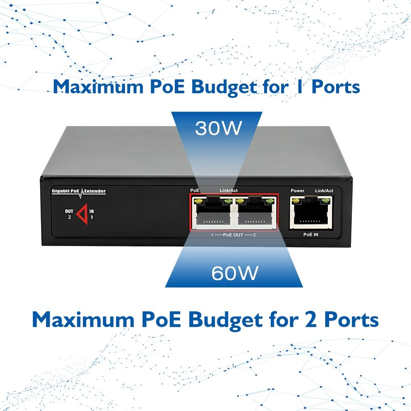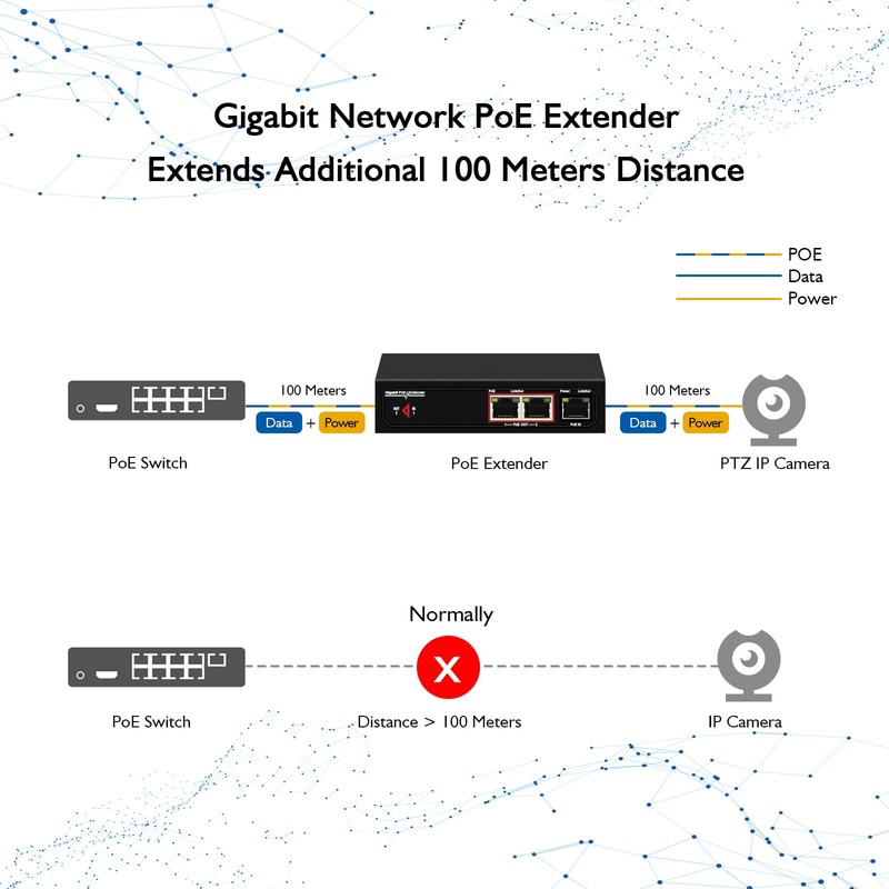 Ethernet and PoE connections both restrict cable distances to 100 meters between network ports. To overcome this distance limit, network installers can simply connect an PoE Extender in-line with the Cat-5e or Cat-6 calbe.