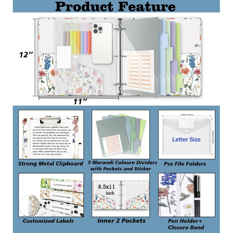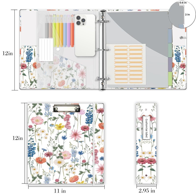 - 【3 Ring Binder wirth Clipboard】The versatile 2 inch binder front has a metal clip board to hold up 500 sheet, extra storage with 2 interior pockets, 5-Tabs plastic pocket dividers, 18-divider label stickers, a Clear Plastic Folder, Pen Holder, Elastic Closure Straps and Rounded Metal Corner Protection. A blank lable with slot for easy customization of spine. Folded size: 11.8*11*2.8 inches, large than normal binder.