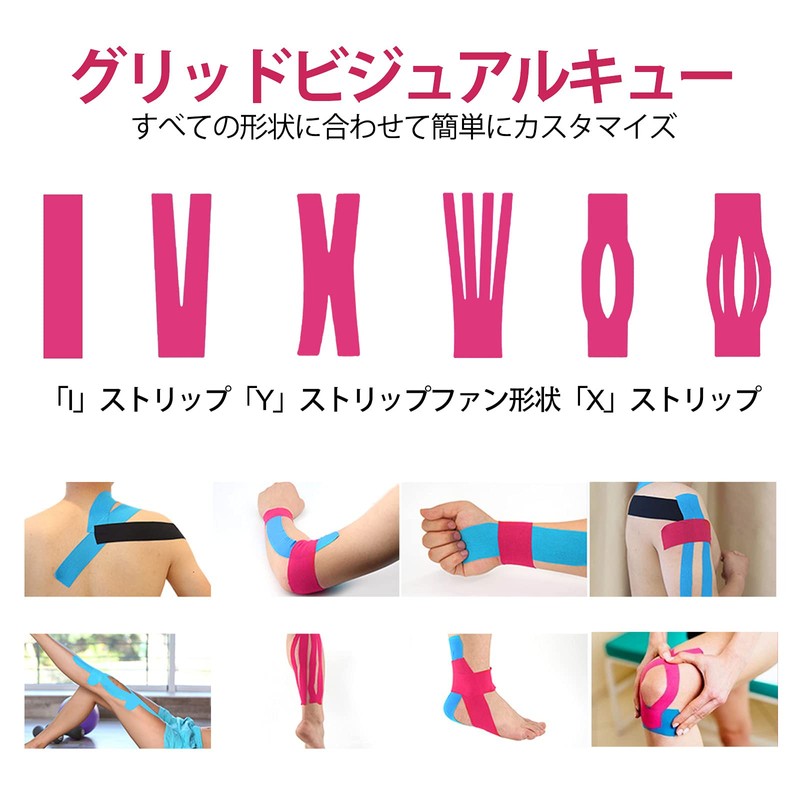 • Kinesiology Tape: Kinesiology tape is elastic taping. Kinesiology Tape Commercial adheres directly to the skin along the muscles to support muscles, joints, ligaments and tendons, preventing injury by preventing excessive muscle stretching. Recommended for those who work out regularly or want to support a specific area with occupational diseases