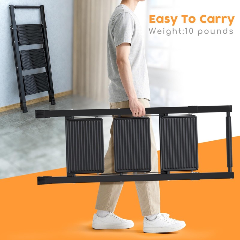 3 Step Ladder, Folding Step Stool with Wide Anti-Slip Pedal Sturdy Steel Ladder with Cushioned Handle for Adults Home (Black)