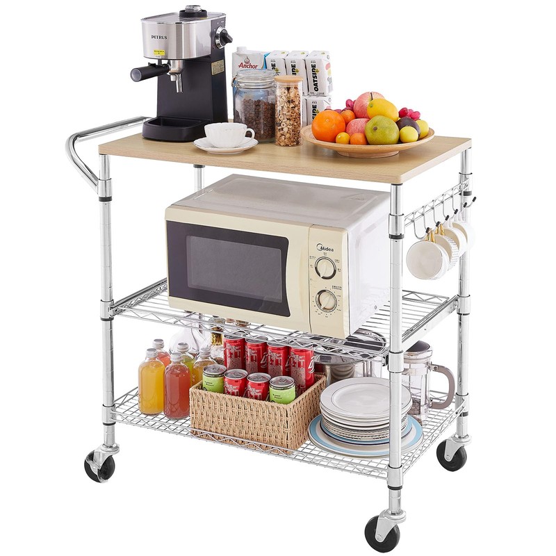- STYLISH & ANTI-RUST DESIGN EASY TO CLEAN : Our microwave cart with wheels features a reinforced thicker wooden top supported by a robust steel frame. Our kitchen island cart with tabletop not only serves a functional purpose but also adds a touch of elegance to your space, its modern design complements any decor style. This rolling carts with wheels metal surface with anti-rust chrome plated, it will not rust make it easy to clean.