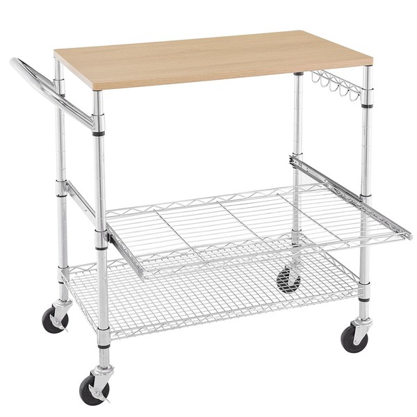 BolDuck 3 Tier Rolling Kitchen Cart with Wood Tabletop, Kitchen Island Carts with Wheels & Slider Shelf, Microwave Cart on Wheels,Coffee Cart & Metal Utility Cart with Hooks, 35.4"L*18.1"W*31.9"H,Wood+Chrome