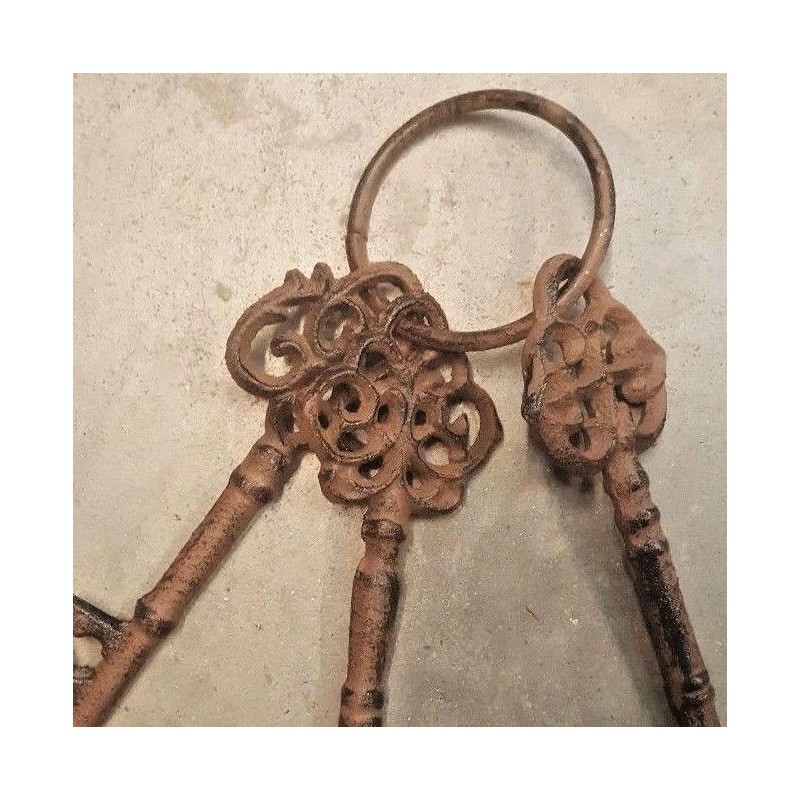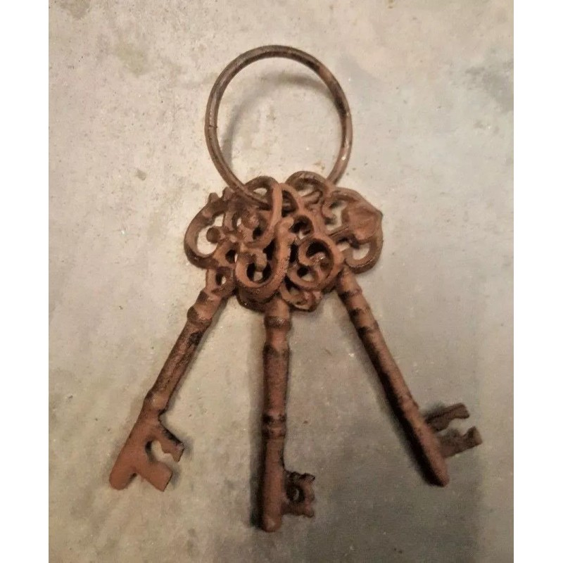 3 Victorian Keys on Keyring Skeleton Church Key rustic brown Cast Iron with ring