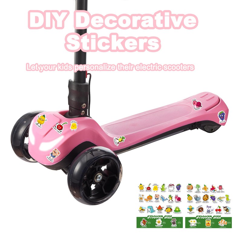 - Personalized & Perfect: Our kids electric scooter comes with LED illuminated wheels, and comes with DIY decorative stickers so your child can personalize their own electric scooter. This unique design makes it the perfect kids scooter for your child.