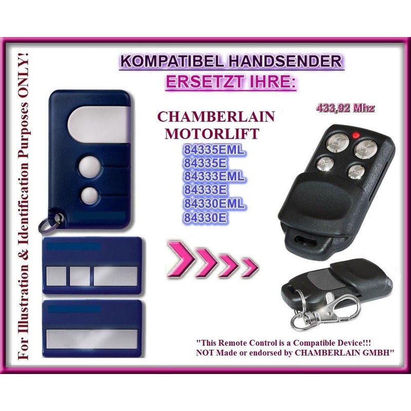- COMPATIBLE REMOTES All Liftmaster remotes starting with "9443" including 94330E, 94333E, 94335E, 94330EWK, 1A5639-7. All motor lift remotes that start with "8433" and end with "EML" including 84335EML, 84330EML, 84333EML