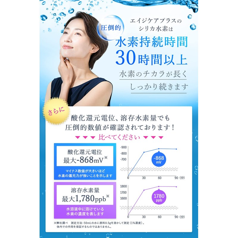 - ✅【圧倒的!水素持続時間30時間以上】 エイジケアプラスのシリカ水素サプリは、水素持続時間30時間以上!水素のチカラが長くしっかり続きます。さらに、エイジケアプラスのシリカ水素サプリは、溶存水素量(※1)が最大「1,780ppb」、酸化還元電位(※2)が最大「-868mV」と圧倒的な数値が確認されております!(※3) ※1 溶存水素量:水溶液中に溶けている水素の濃度を表します。※2 酸化還元電位:マイナス数値が大きいほど水素の還元力が強いことを示します。※3 弊社調べ 体内での作用を保証するものではありません。 測定方法:50mlの水に原料0.5gを溶かして測定(1%濃度)。