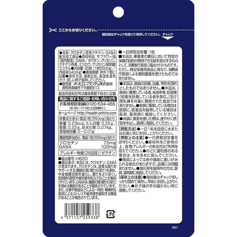 - <届出表示> 本品には、クロセチン、GABAが含まれます。クロセチンは、良質な眠りをサポートする(睡眠の質(眠りの深さ)を高め、中途覚醒回数を減らし、眠りをより深くし起床時の眠気や疲労感を和らげる)ことが報告されています。GABAは、睡眠の質(眠りの深さ)を高める機能があることが報告されています。また、仕事や勉強などによる一時的・精神的な負荷によるストレスや疲労感を緩和する機能があることが報告されています。