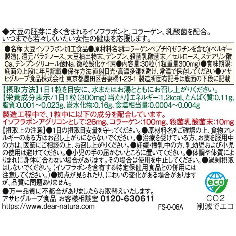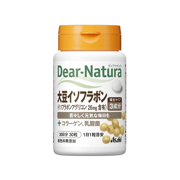 [Product Description] "Dear Natura Soy Isoflavone with Red Clover 30 Tablets" are nutritional supplements with isoflavones and red clover. There are 26mg of isoflavones per tablet. It supports women's health. Artificial flavoring, coloring, and preservative free. [Directions] Take 1 tablet per day with warm or cold water. [Caution] Babies, infants, pregnant women and breastfeeding women should avoid taking this product. Do not exceed the recommended dosage. (Be cautious of taking with other specified health products containing isoflavones.) Consult with a doctor before use if you are in a medical institution. Please do not exceed the suggested dose of 1 per day. On rare occasions, this product may not agree with your constitution. In such a case, please refrain from use. Keep this product out of reach of children. It uses natural ingredients, so there may be changes in color or smell, but this does not affect quality. The specks seen on the surface come from the ingredients. [Storage] Store away from direct sunlight and moisture...