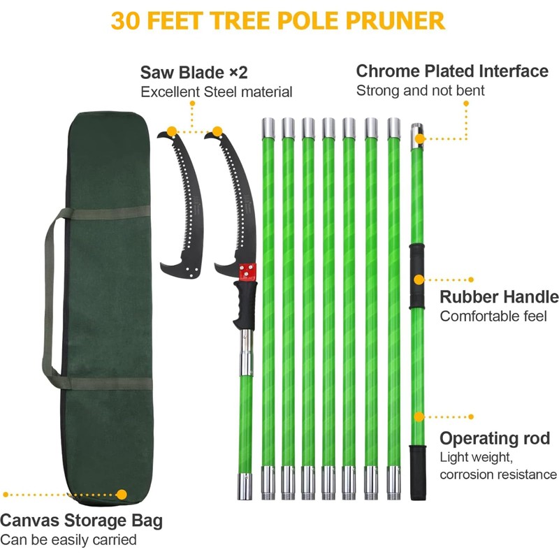 - 【Safe and Reliable】:You can easily prune high and hard to reach branches on even tall trees, and do it without the hazard of climbing a ladder, You also can trim at ground level without bending or kneeling. with a sturdy tree trimming system that can extend up to 30 feet.Pruning your own trees and shrubbery now will be easier and safer than ever before