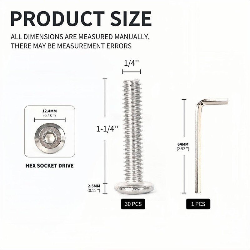 • Complete Kit for Convenience:Each package includes 30 pieces of 1/4-20 x 1-1/4" flat head hex socket cap screws, 1 hex spanner, and a transparent storage boxfor easy organization. Whether you're a professional or a DIY enthusiast, this all-in-one kit has everything you need to get the job done right
