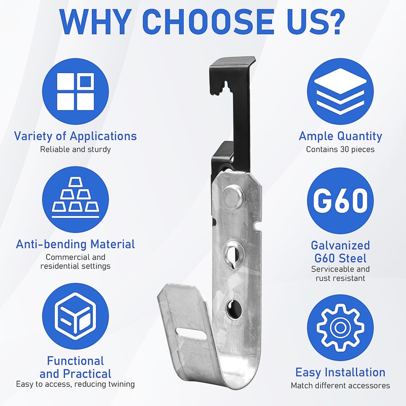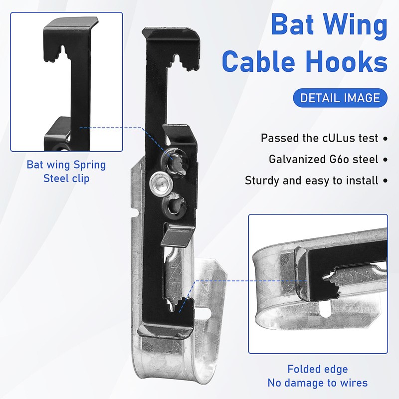 - Reliable and Quality: the J shape wire hooks for cables have passed CULUS test; Enjoy the quality and durability of the J hook hangers that are made from G60 galvanized steel, offering excellent resistance to rust and corrosion; The bat wing part uses 1.0 mm C1065 steel, and the finish is black E coating, ensuring stability once installed, offering reliable performance day in and day out