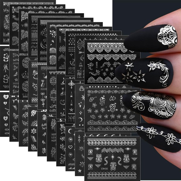 30 Sheets Silver Nail Sticker Silver Lace Nail Art Stickers Silver Retro Flower Star Moon Heart Cat Design 3D Self-Adhesive Nail Sticker Decals Nail Supplies for Women Girls DIY Nail Art Decoratio