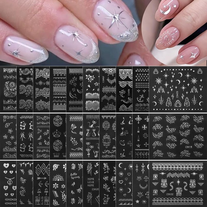- Silver Nail Sticker:You will get 30 styles silver nail art stickers in one set of different silver lace hollow shapes flower star moon heart cat nail stickers, satisfy all your love for beautiful nails, a variety of elements for you to choose from to DIY your own nail art designs