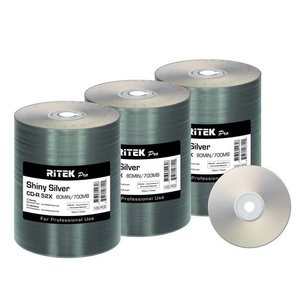 300 Pack Ritek Pro (Professional Grade) CD-R 52X 700MB Shiny Silver Lacquer Silk Screen Printable Blank Media Recordable Disc