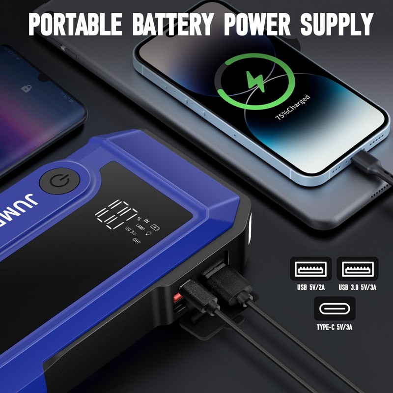 - Multi-Function: In addition to jump starting, it features a 5V/2.1A USB port for charging devices, an LED flashlight with strobe mode, and a 12V/10A output port.