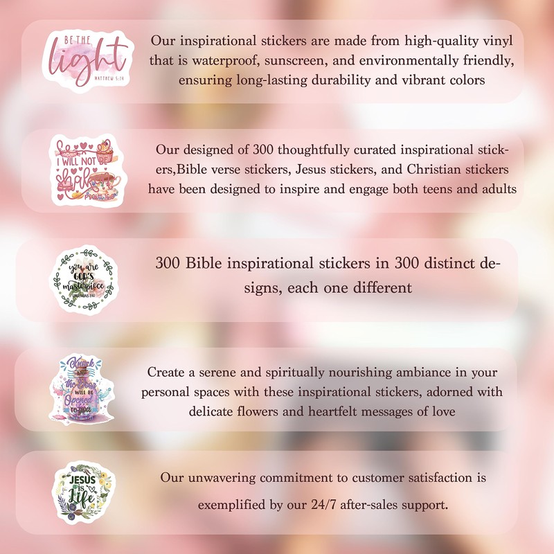 - [Verses That Resonate]: Our designed of 300 thoughtfully curated inspirational stickers,Bible verse stickers, Jesus stickers, and Christian stickers have been designed to inspire and engage both teens and adults, fostering a deeper connection with faith and bringing a radiant, uplifting energy into their lives. Each sticker features a unique combination of scriptures and floral elements, creating an exquisite and harmonious design.