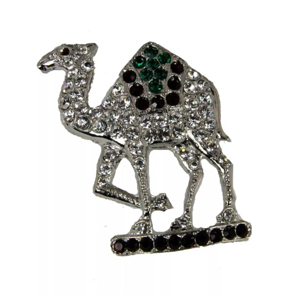 This is a beautiful Camel Shriner Tassel Holder.  Finished in a polished silver tone, is filled with brilliant sparkling faceted rhinestones.  Has a straight pin on the back side. These are brand new.  It measures 2.5 inches across.  Will ship in a nice gift box.  I am entering many more brand new beautifully designed Tassel Holders that are all very nicely constructed.  DO NOT USE THE PINS ON THE BADGE TO POKE THE HOLES IN THE ITEM YOU ARE ATTACHING IT TO.  THE PINS COULD BREAK OFF.  USE A SMALL NAIL, THUMB TACK OR ANYTHING ELSE BUT THE PINS ON THE BADGE.