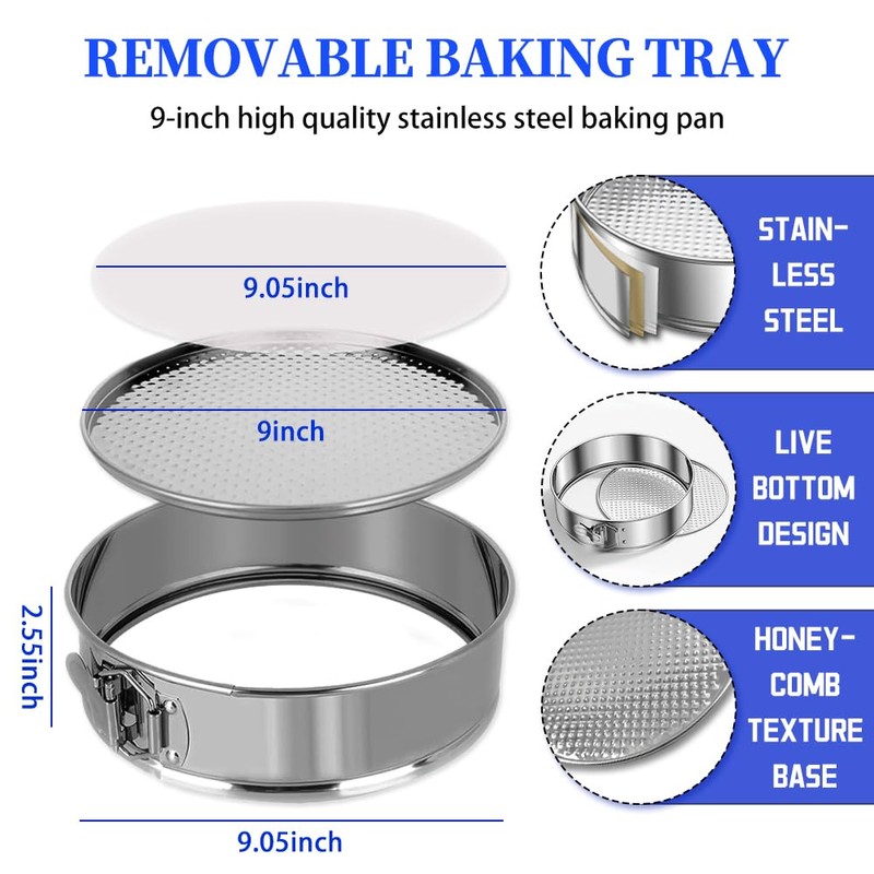 - 1. 🎂 Nonstick 304 Stainless Steel 9 Inch Springform Pan: Crafted from premium 304 stainless steel (no toxic coatings), this pan withstands 500°F oven, (BPA/lead-free) that survived 200+ bakery stress tests. From 450°F crusty focaccia to icy no-bake strawberry mousse, it won’t warp or react with acids like cheaper pans. Even your keto lemon bars won’t stick when prepped with included parchment paper!