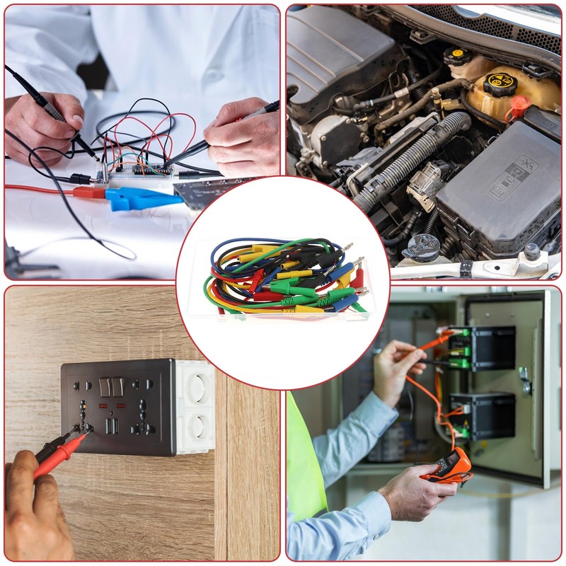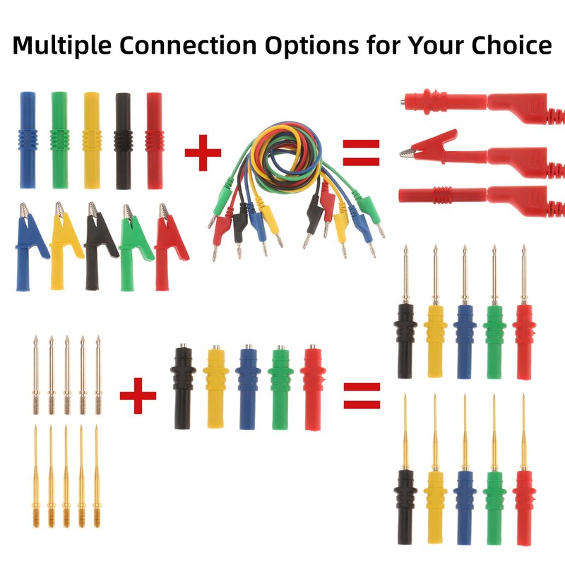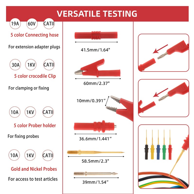 - 30PCS TEST PROBE LEADS KIT: You will get 5 x 1M stackable banana plug test leads, 5 x 58.5mm gold plated probes, 5 x 39mm nickel plated probes, 5 x alligator clips, 5 x probe holders, 5 x connecting hoses, 1 x wrench, 1 x storage case. Compatible with all multimeters, clamp meters, and test instruments. Removable tips, banana plugs, alligator clips, and connecting hoses boost testing versatility and flexibility—expanding your digital multimeter's functionality.