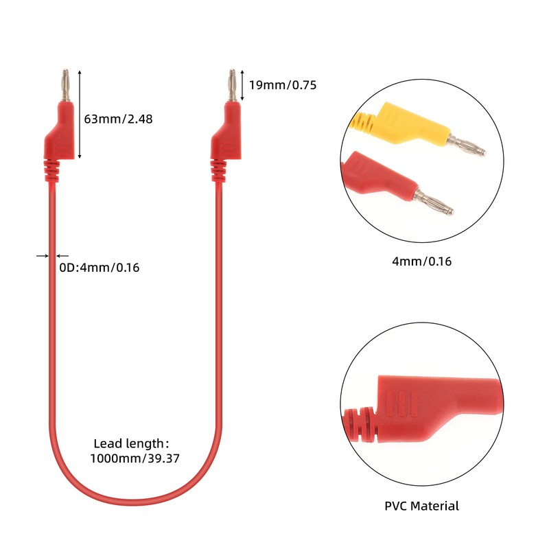 - STACKABLE BANANA PLUG: The banana socket allows for multiple banana plugs to be inserted simultaneously, enhancing flexibility and durability. The banana plugs, made of durable materials, offer high insulation to ensure optimal lead performance. Voltage/Current: 1000V/19A. Length: 1M. Banana Plug: 4 mm.