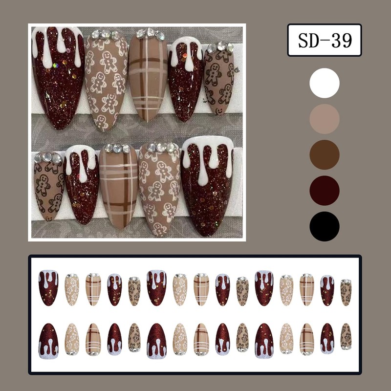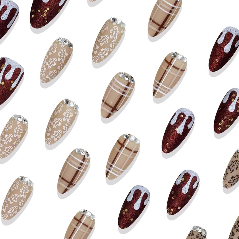 30Pcs Cute Gingerbread Man Press on Nails Medium Almond Fake Nails Cute Christmas False Nails 3D Rhinestones Design Stick on Nail Brown Stripes Artificial Nails Wine Red Glitter Nail for Women
