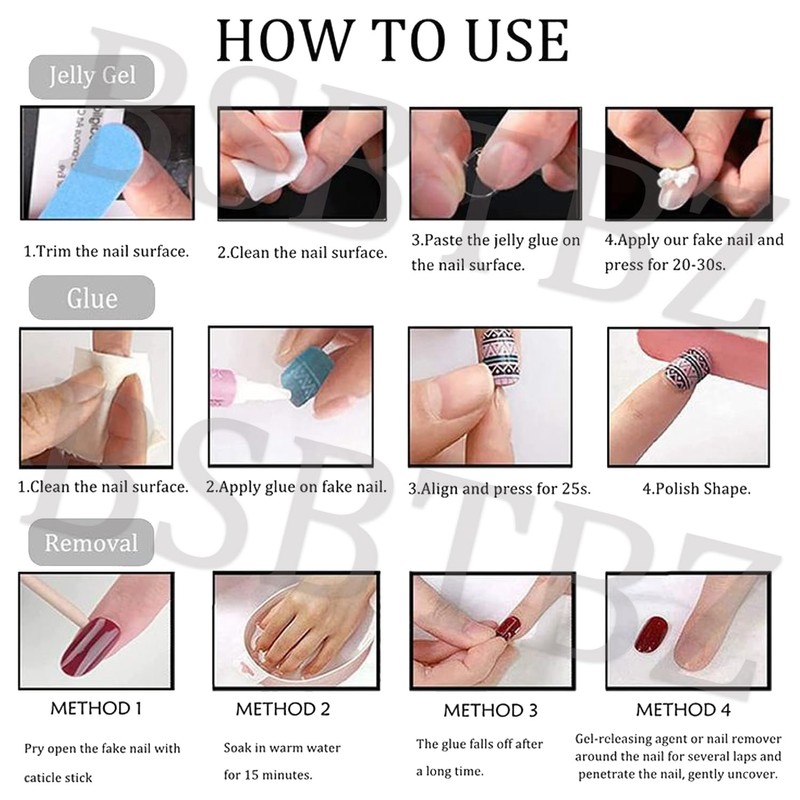 -Artificial fake nails with jelly glue, won't hurt your nails.