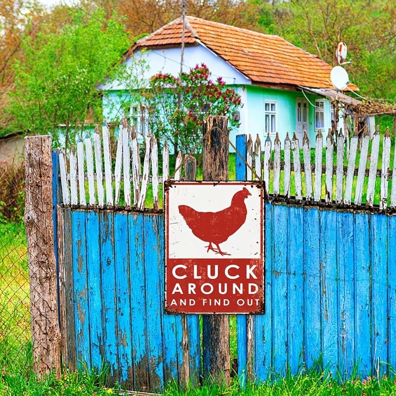 30x20cm Metal Farm Sign - Cluck Around Humorous Warning - Red & White Chicken Art - Rustic Decor for Hen Yard, Chicken Coop & Outdoors Fence