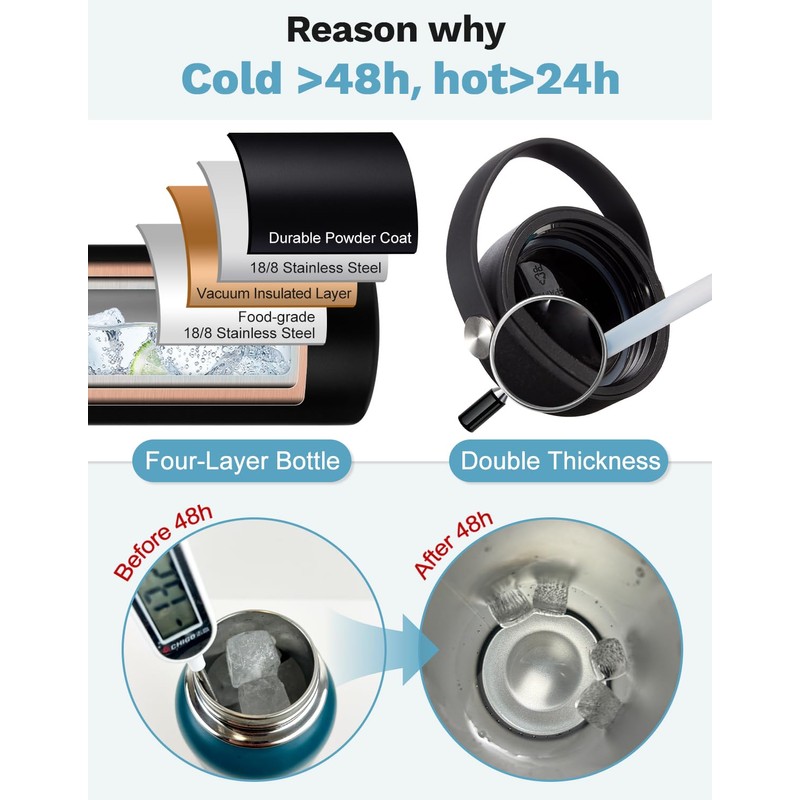 - 48 Hr COLD / 24 Hr HOT: The BENZZO insulated water bottle with copper-plated triple-wall vacuum insulation is tested to keep your drinks ice-cold for up to 48 hrs and comfortably warm for 24 hrs. This water jug has a wide mouth opening, making adding ice and washing super convenient. Get this gym water bottle to up your sport fitness track,ensuring a healthy hydration experience.Every sip is absolutely cool!