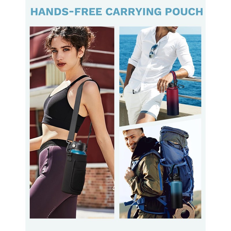 - HANDS-FREE BOTTLE CARRIER BAG & PROTECTIVE BOOT - Metal water bottle with hands-free shoulder carrier bag that features 2 storage pockets for your phone, cards, and keys, and the shoulder carrier pouch also provides extra insulation. The silicone protective boot fully protects the reusable water bottle from additional damage and prolongs the life of the thermo water flask bottle.