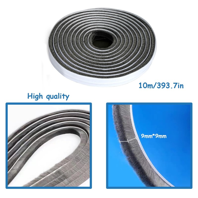 Measuring 0.09m x 0.09m in cross-section and 10m in length, this weather stripping brush is designed to fit a range of door sizes and types, including windows, wooden doors, sliding doors, and even closet doors. It's made from high-quality material that's both durable and long-lasting, ensuring it will maintain its performance and appearance over time.