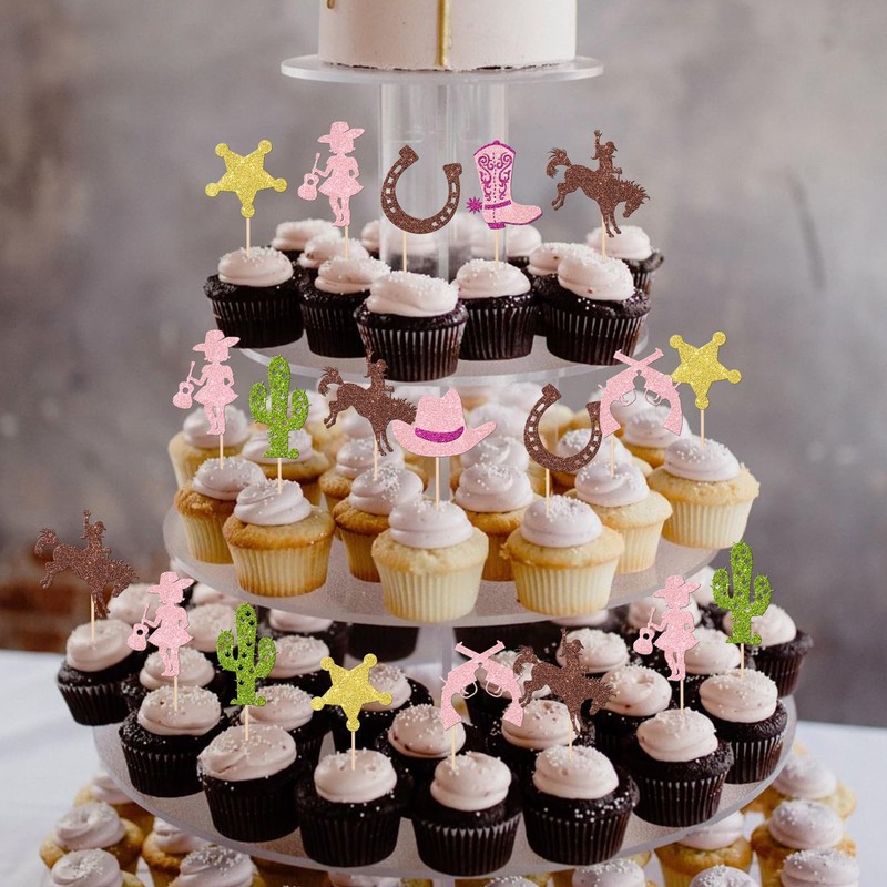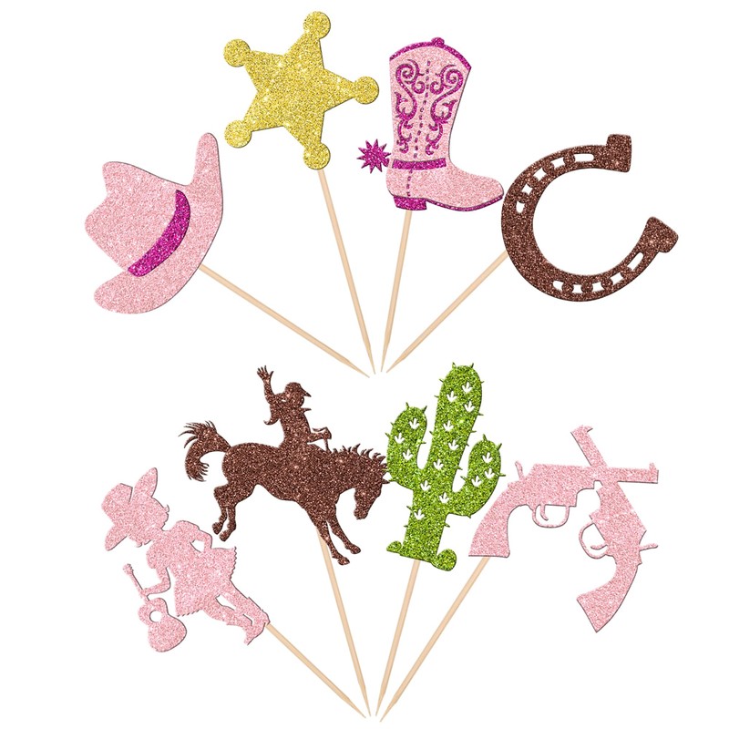 32 piezas de decoración de magdalenas de vaquera, zapatos de caballo con purpurina, pistola de cactus, púas de magdalenas, sombreros de vaquera, botas para decoración de magdalenas con temática occidental, baby shower, niñas, fiesta de cumpleaños, decora