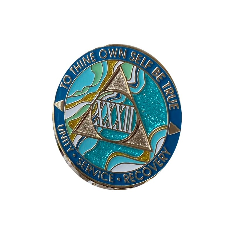 32 Year AA Medallion Elegant Marble Caribbean Aqua Glitter Gold Sobriety Chip