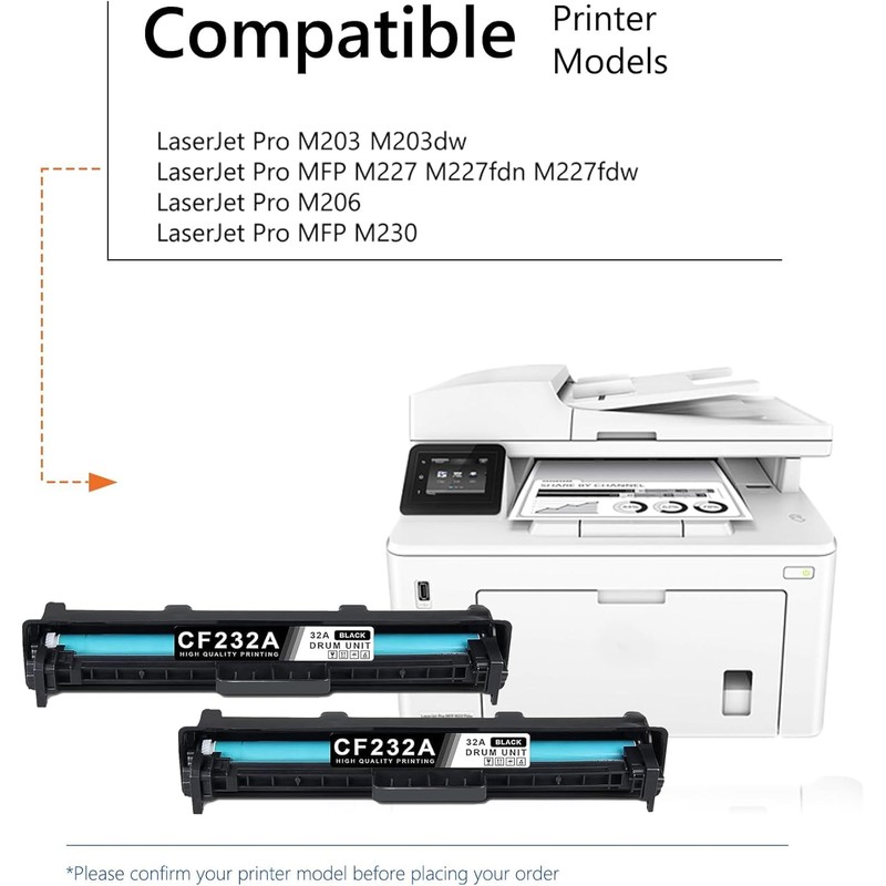 2 Pack Black 32A CF232A Drum Units. (Not Include Toner) Our high-capacity compatible 32A CF232A High-Yield drum unit is suitable for a wide range of printer models: Laser Pro M203 Laser Pro M203dw (G3Q47A) Laser Pro M206 Laser Pro MFP M227 Laser Pro MFP M230 Laser Pro MFP M227fdn (G3Q79A) Laser Pro MFP M227fdw (G3Q75A) This is awesome drum unit. You'll love it. This printer 32A CF232A drum unit is the very good drum units on the market. This is perfect for your business or personal use. Our drum units are easy to use and are of the highest quality. Print quality: It works seamlessly with your printer to ensure the quality and efficiency of your work. Bright, vibrant and clear effects make your work easier.We are experts in the printing industry, so we can produce high quality printed products without any bleeding or streaking. 32A CF232A drum unit is the perfect solution for your office printing needs. This high quality drum unit has been built in smart chip technology that allows the printer to monitor the toner level. Clean and eco-friendly materials: Our drum unit is professionally manufactured with non-polluting and environmentally friendly materials. So there is no unpleasant and pungent smell when printing, which is more protective of your health. We will track your order in real time to ensure that the product reaches you in time and correctly. If you have any questions, please feel free to ask us and we will provide you with efficient solutions right away. We hope you have a great shopping experience!