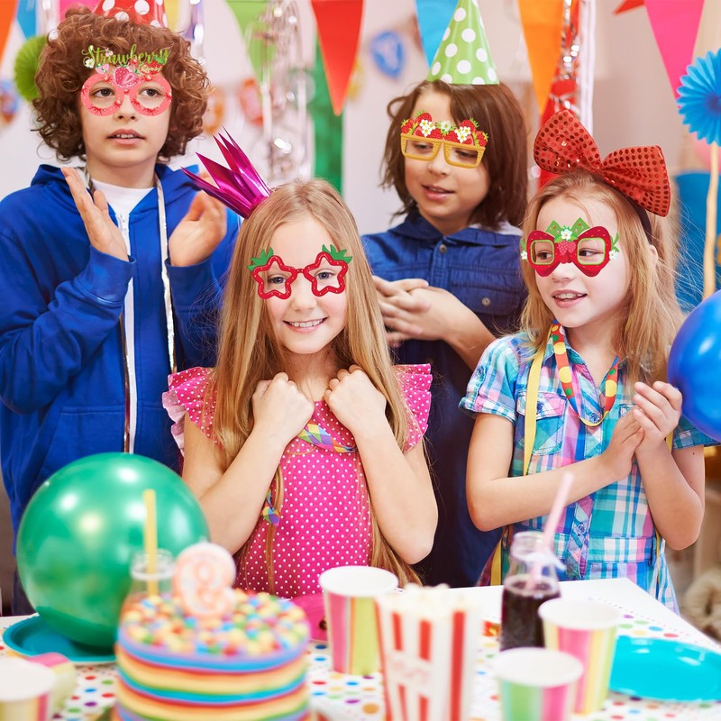 - Strawberry Party Decorations: 32 pairs of berry strawberry paper glasses in 16 different styles. Celebrate your baby girl's first birthday with this strawberry eyeglasses that she will love strawberry party supplies in pink, red, and green strawberry and floral designs, novelty design and bright colors will make you stand out of the crowd easily