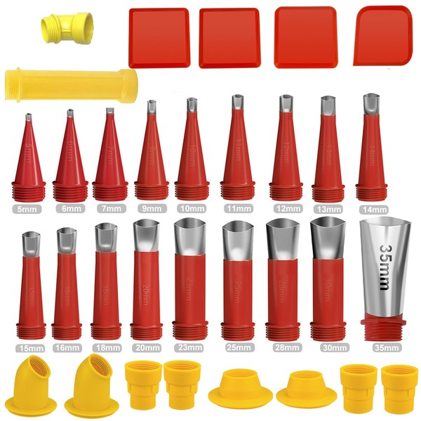- Package Complete Combination: Universal stainless steel silicone caulking nozzles contains 18 different sizes of caulking nozzles of 5 mm, 6 mm, 7 mm, 9 mm, 10 mm, 11 mm, 12 mm, 13 mm, 14 mm, 15 mm, 16 mm, 18 mm, 20 mm, 23 mm, 25 mm, 28 mm, 30 mm, 35 mm and 10 connecting bases and 4pcs scraper to connect the base. There are sufficient quantities for you to use to make the next work smoother.
