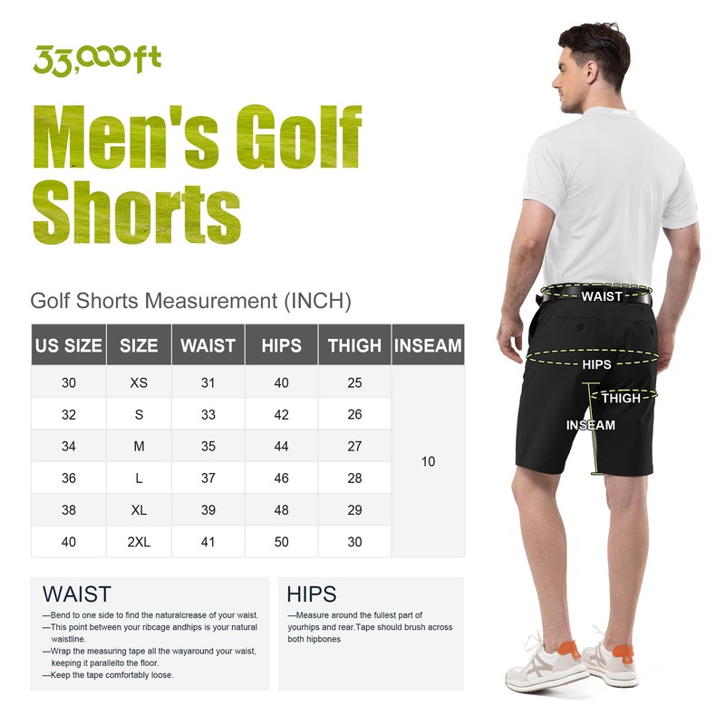 - Classic-Fit: 33,000ft Classic-Fit golf shorts mens features adjustable waistband and 4-way stretch fabric providing greater comfort and flexibility when you’re taking your swing or bending over to pick up your ball.