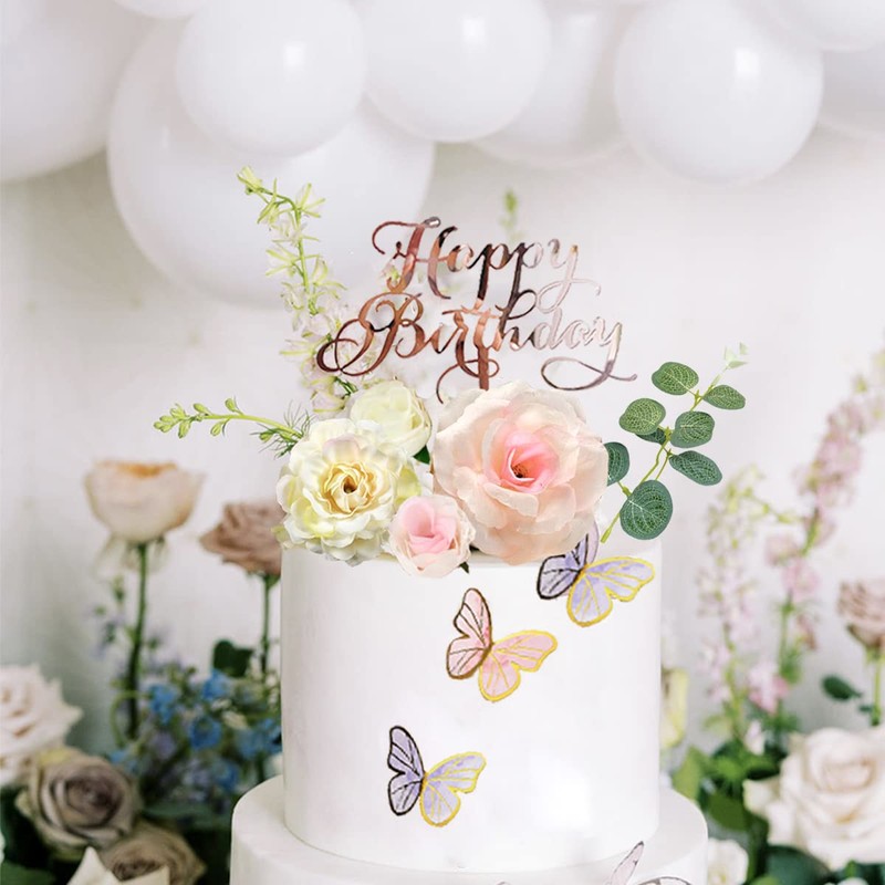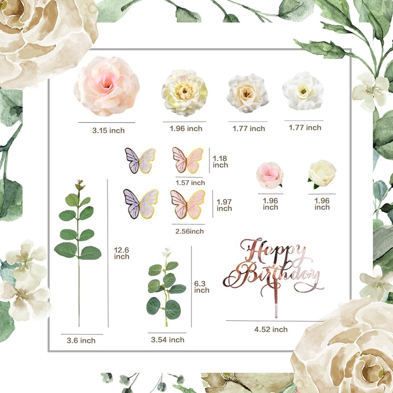 - Paquete: recibirás 5 decoraciones para tartas de rosas de flores, 1 rododendro, 11 mariposas moradas, 11 decoraciones para tartas de mariposa rosa, 4 hojas de eucalipto, 1 decoración para tartas de cumpleaños de oro rosa, muy elegante y muy valioso. Las dimensiones específicas se muestran en el dibujo.