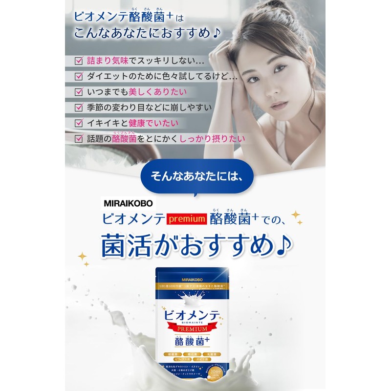 - 🥛【管理栄養士のコメント】「食事から摂取しにくい短鎖脂肪酸の酪酸菌が1日分で1億1000万個入ったビオメンテを推奨します。」(「ビオメンテpremium酪酸菌+」は2021年から現在までパラリンピック水泳選手の食事サポートを行う管理栄養士の秋山華沙里先生に監修していただいております)※本製品はサプリメントの老舗企業 株式会社AFC-HD アムスライフサイエンス(東証プライム上場企業)の 国内GMP認定工場にて製造している国産日本製サプリメントです。(MIRAIKOBO製品は安心してお召し上がりいただくため、パッケージ袋も含めて海外製を使用せず、日本製パッケージを使用しております。)