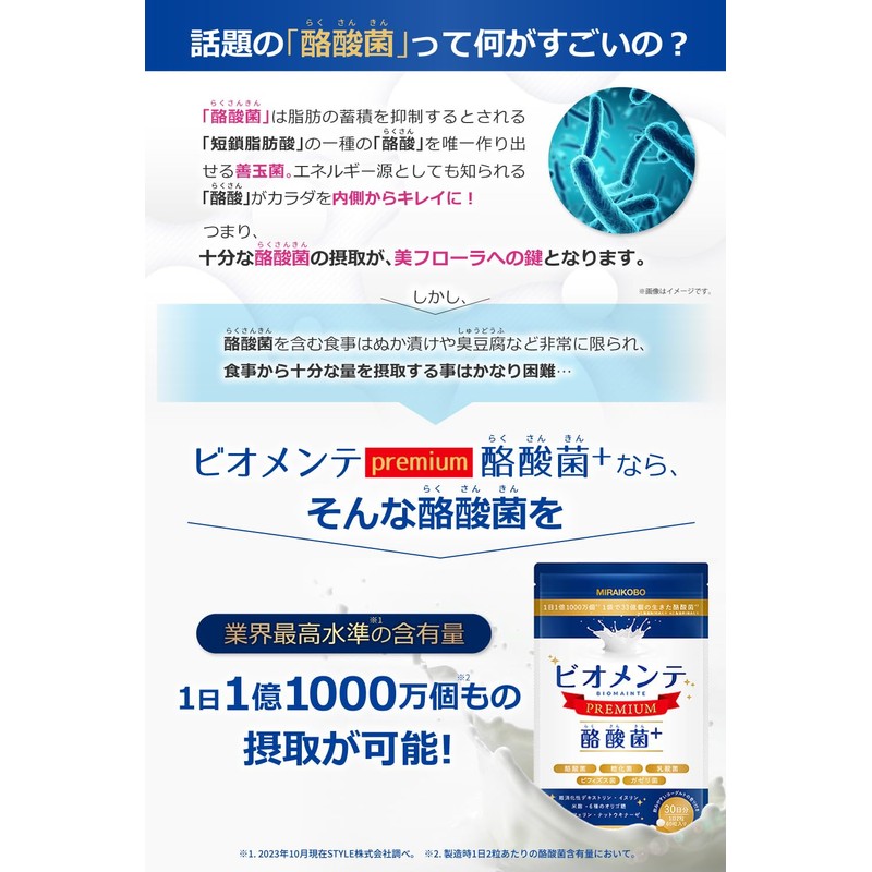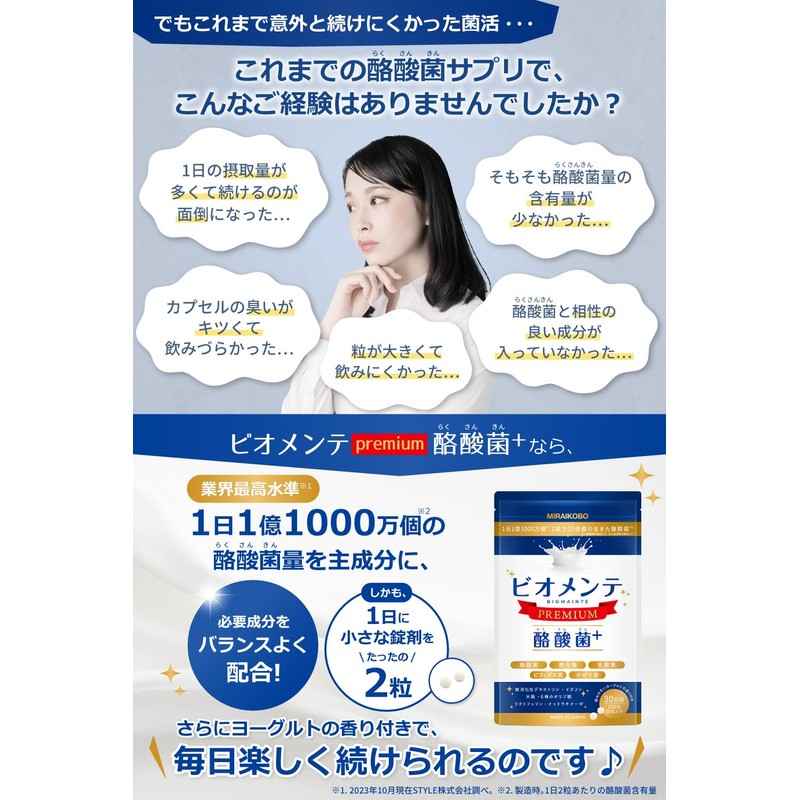 - 🥛【長野県産の酪酸菌が1袋に33億個、1日1億1000万個】「ビオメンテpremium酪酸菌+」には業界最高水準(※1)となる1袋に33億個、ヨーグルトの香りで小さなお子様や女性に飲みやすい直系9ミリの小さな錠剤状のタブレット2粒(1日分)に1億1000万個の長野県産の生きた酪酸菌(※2)をぎゅっと詰め込みました。 ※1.2023年11月現在※2.製造時