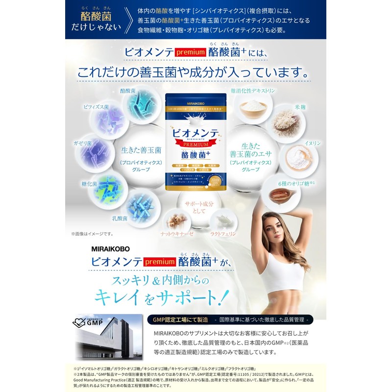 - 🥛【酪酸菌と好相性の水溶性食物繊維類も配合】「酪酸菌」は善玉菌のエサである水溶性食物繊維やオリゴ糖、穀物麹と一緒に摂取することで効果を発揮すると言われており、「ビオメンテpremium酪酸菌+」には生きた善玉菌(プロバイオティクス)として「酪酸菌」「糖化菌」「乳酸菌」「ビフィズス菌」「ガゼリ菌」と、対する善玉菌の餌(プレバイオティクス)となる「難消化性デキストリン」「イヌリン」「米麹」※「6種のオリゴ糖」(フラクトオリゴ糖、イソマルトオリゴ糖、ガラクトオリゴ糖、キシロオリゴ糖、キトサンオリゴ糖、ミルクオリゴ糖)をバランスよく配合させることで体内フローラを整え「スッキリ」と、そして「内側からのキレイ」を目指し開発しました。※紅麹は使用しておりません。