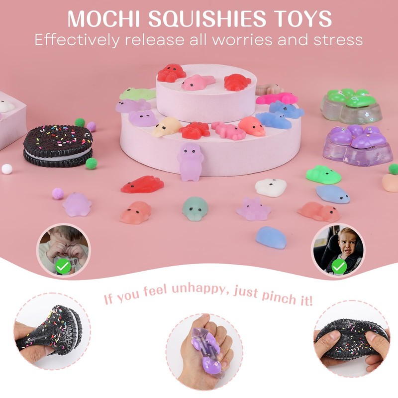- 33 pieces mochi squishy toys: contains 30 random mini mochi squishy toys, 2 cat paws mochi squishy toys (green and purple) and 1 black biscuit mochi squishy toy. These toys have bright colors, are varied in style, cute in shape and individually wrapped. By touching, squeezing and stretching, they can distract people's attention, loosen the mood and relieve stress and anxiety.