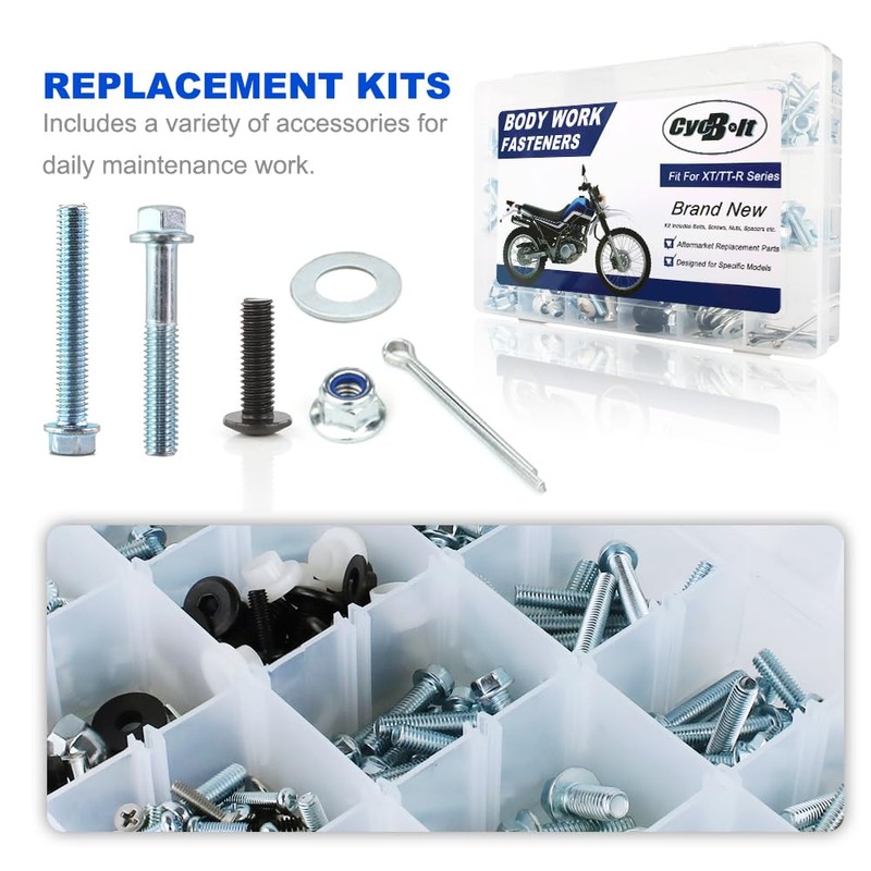 - The Body Work Fasteners Kit Provides Various Bolts and Screws Designed Specifically for Motorcycle Bodywork Maintenance. It Ensures That Motorcycle Components Firmly Attached to the Motorcycle Frame, Maintaining Motorcycle Structural Integrity.