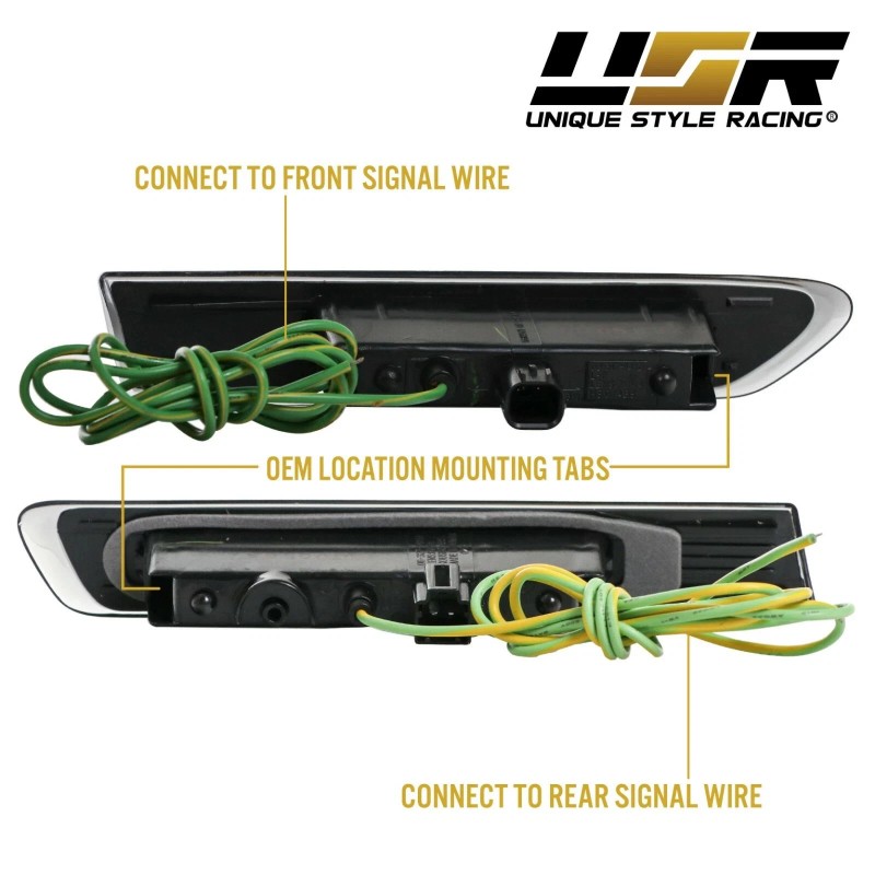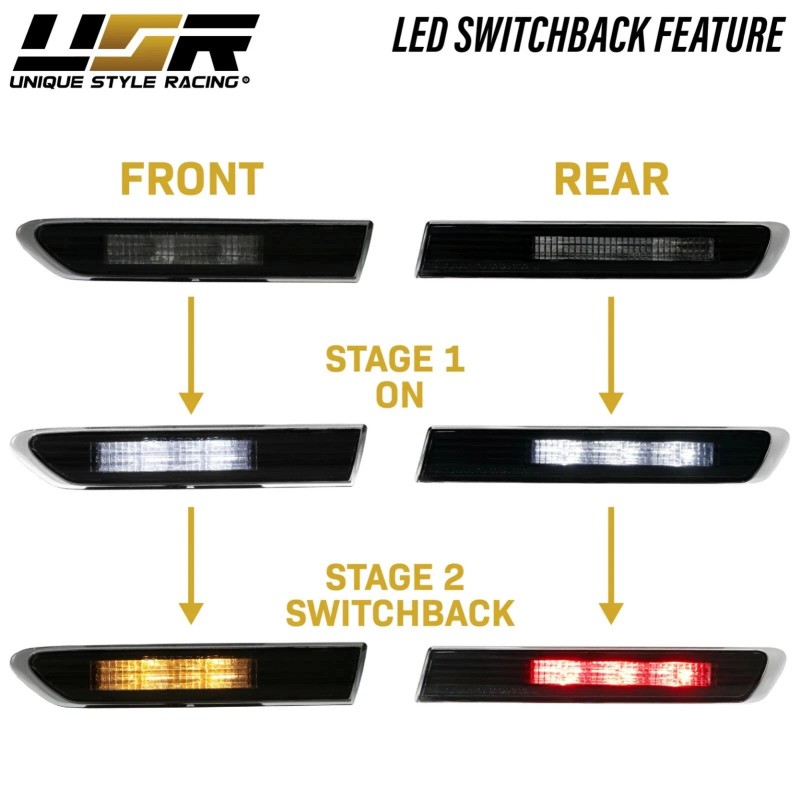 - Dual Stage Switchback Edition Side Markers provide a LED White Upgrade and an Optional 2nd Stage which turns on when the Additional Green Wire is Tapped onto your desired Feature. Front Side Markers Second Stage will light up Amber whereas Rear will light up Red.
