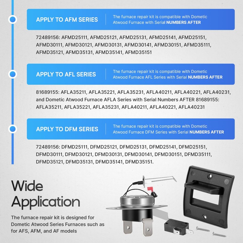- Apply to AFM Series: The furnace repair kit is compatible with Dometic Atwood Furnace with Serial Numbers After 72489156: AFMD25111, AFMD25121, AFMD25131, AFMD25141, AFMD25151, AFMD30111, AFMD30121, AFMD30131, AFMD30141, AFMD30151, AFMD35111, AFMD35121, AFMD35131, AFMD35141, AFMD35151.