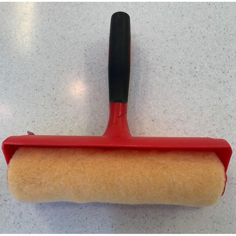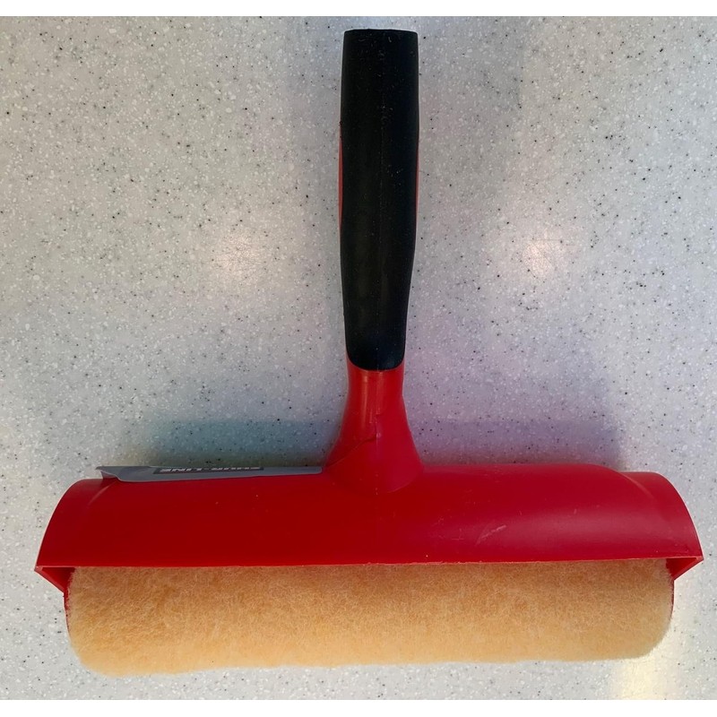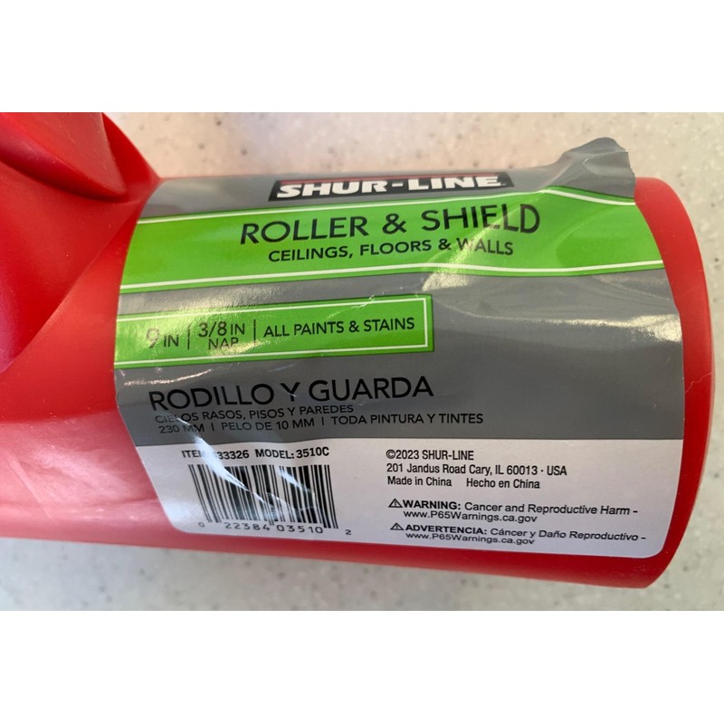 9" Red Plastic Paint Roller Splatter Shield , with Included 9" x 3/8" Nap Roller Cover. Threaded handle fits standard threaded paint poles. Ergonomic rubberized hand grips. Head angle is adjustable using thumb lever. Washable and reusable cover keeps most paint spatters to a minimum. Especially useful when painting over head ceilings, etc.