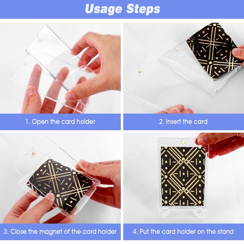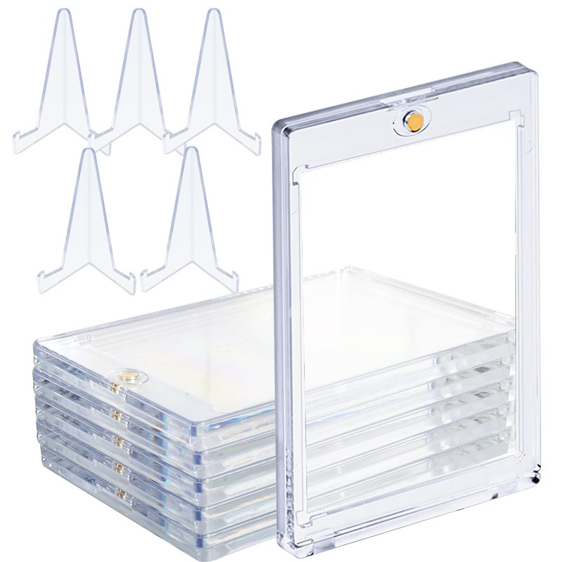 - SPACE EFFICIENT CARD ORGANIZATION In total, the set offers 6 card frames and 6 stands, ideal for organizing and displaying your entire card collection while saving space. Total 6 x acrylic card frames, 6 x feet, suitable for standard card sizes